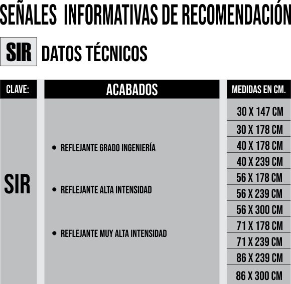 Los acabados para este tipo de señalamientos pueden ser: